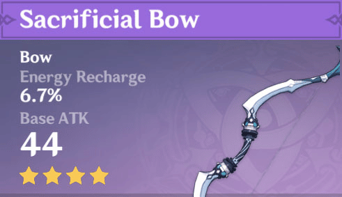 Sacrificial Bow is a good alternative 4-star bow for Gorou with an increase in Energy Recharge. Gorou has a 40% chance to end his own Elemental Skill’s Cooldown after using the skill once every 30s.