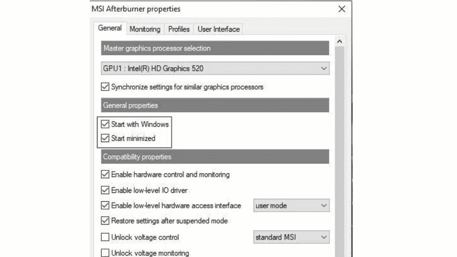Click on the Settings button on the MSI Afterburner application and go to the general tab. Here check the boxes stating Start with Windows and Start minimized.