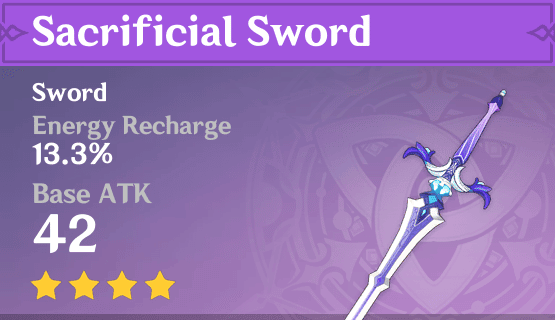 Another good sword is the Sacrificial Sword. It has a lower Elemental Recharge, but it has a high chance of resetting the Elemental Skill cooldown once every 30s.