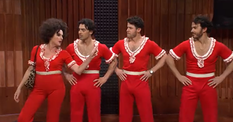 Joe, Kevin and Nick Jonas then emerge, clad in matching red pantsuits to perform Sally’s signature kick, stretch, kick move.