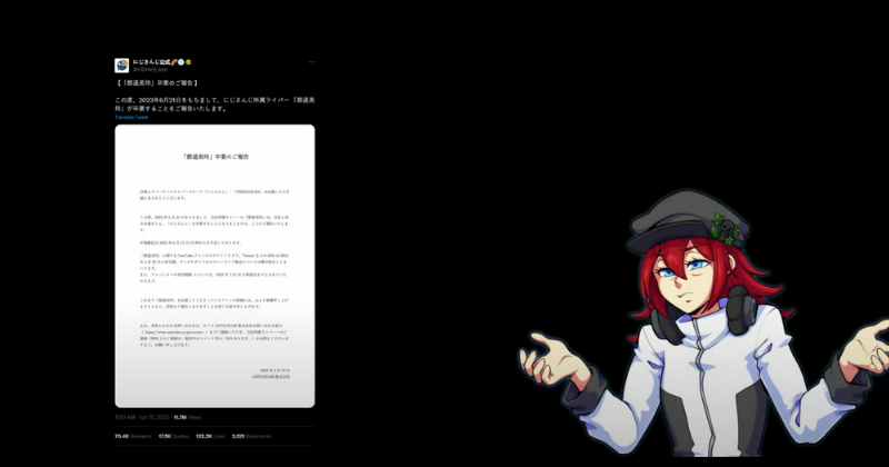 The translated statement reads: “We would like to report that upon mutual agreement, Mirei Gundo will graduate from Nijisanji on June 21, 2023. The graduation stream is scheduled to be held at 11 PM on June 21, 2023.”