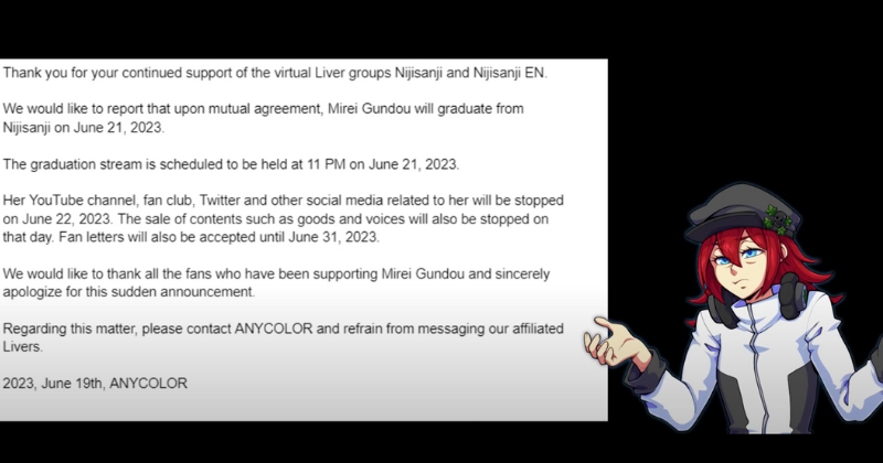 The translated statement reads: “We would like to report that upon mutual agreement, Mirei Gundo will graduate from Nijisanji on June 21, 2023. The graduation stream is scheduled to be held at 11 PM on June 21, 2023.”