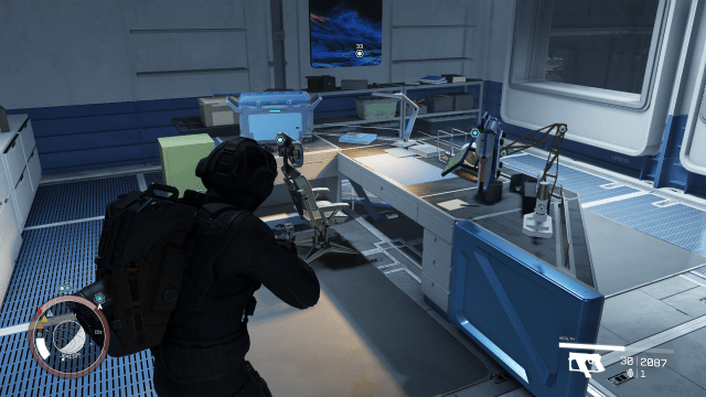 Get out of the cabin using the orange door. Make your way to the busy researchers. Access the floor above it using the containers. Find the empty computer terminal to disable security protocols and activate security robots. These robots will now turn against Infinity employees.